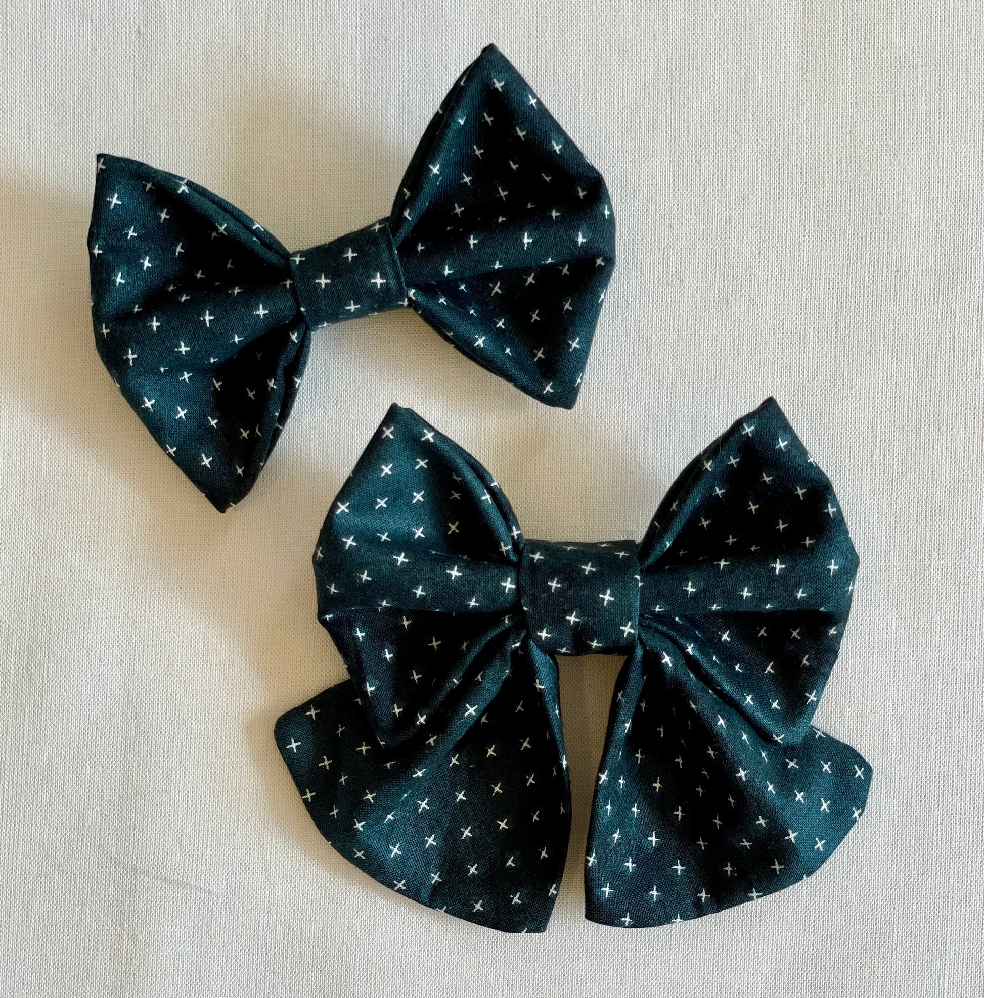 All bows are handmade, so patterns and sizes will vary slightly. There are two 1.5" elastic bands at the back of the bows.