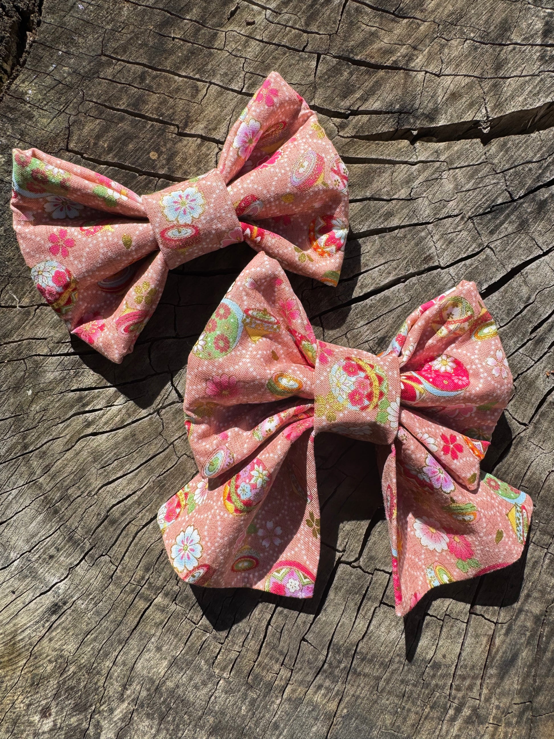All bows are handmade, so patterns and sizes will vary slightly. There are two 1.5" elastic bands at the back of the bows.